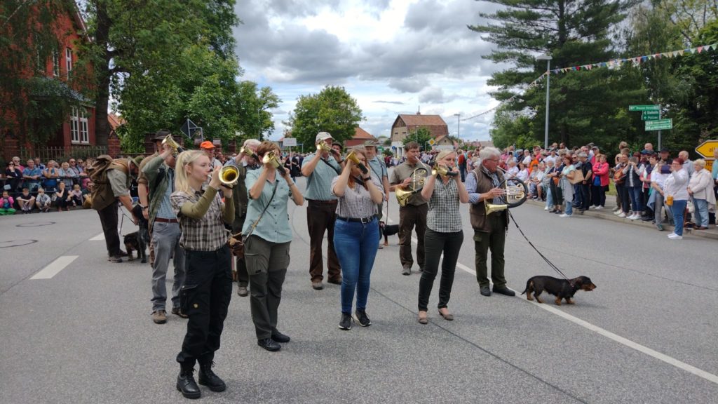 Ein großes Highlight war der Festumzug am Sonntag. Sämtliche Vereine aus der Region zogen durch die Innenstadt von Osterwieck. Unsere drei Jägerschaften wurden durch mehrere Jäger und Hundeführer präsentiert. Die musikalische Begleitung bot die Bläsergruppe Blankenburg der Jägerschaft Wernigerode. Es war eine überwältigende Stimmung, die vom Publikum kam. Oftmals hielten wir an, um noch ein Stück vorzutragen, auch unsere vierbeinigen Jagdfreunde bekamen so manche Streicheleinheiten.